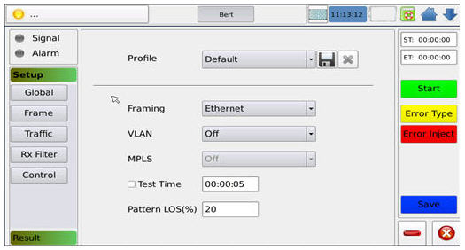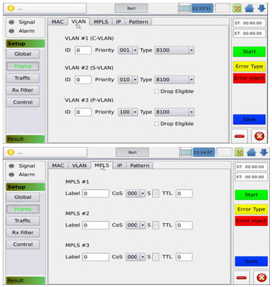 支持在VLANMPLS環境下的2-4BERT測試,工程師可以通過觸摸屏設置BERT測試數據幀的層數,幀長,帶寬,MAC地址,五類元參數還有負載區的偽隨機碼型,XGT-200除了支持標準的偽隨機碼型(PRBS31PRBS23PRBS20PRBS15PRBS11和翻轉型)也可以支持CJPATCRPAT這樣的壓力測試碼型,更可以由工程師自定義碼型仿真不同的應用環境。在BERT測試過程中,可以通過操作界面上的故障注入模式,來進行不同的故障,例如:BITCRCIP ChecksumTCP/UDP Checksum錯誤,來驗證被測網絡或者被測點對網絡異常幀的處理能力。